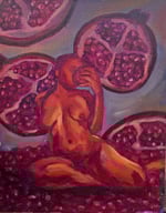 Fun figurative paintings with fruits and foods in the background.